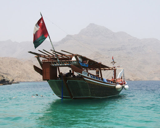 After wanting to for a while, I finally booked a trip on a dhow boat that took us through the khors (fjords) of Musandam. It was sooooo nice!! Went from 9am-4pm & I was worried it was going to be a bit miserable because of the heat, but it could hardly have been nicer. Yeah, it was pretty damn hot & humid, & dhows are traditional boats which aren’t air conditioned or anything….but it was shaded & the breeze from moving across the water kept things comfortable. We stopped three times to jump off the boat & go snorkeling — the water was crystal-clear & full of beautiful fishes & coral. There was a small barbecue on the boat for lunch with fresh fish & everything.