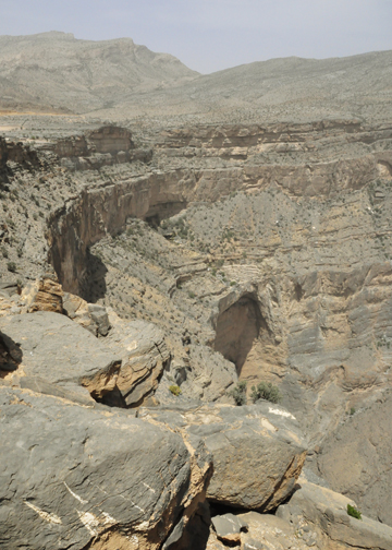 entrance to the sultan’s palace in muscatAfter Muscat a move from the seaside into the Hajjar mountains and Nizwa, where I had hoped for cooler weather. Disappointingly, it was not at all cooler, except for near the top of Jabal Shams (which you access from a windy dirt road), the highest peak in Oman and located near Nizwa. The views and canyon up there were pretty fantastic, too. You certainly weren’t very tempted to step too close to the edge of the gorges to get a closer look at the often shocking drop.