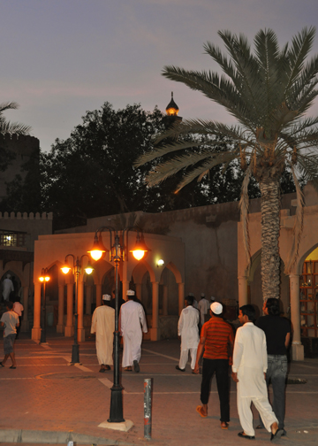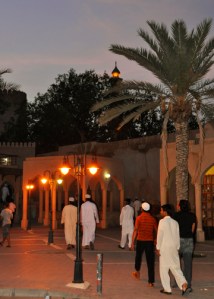 path through the falaj and date palms in wadi tanufThat evening, back in Nizwa, we set out to find some shawarma (and I also was hankering manakeesh, but that hankering went unfulfilled) and strolled through the very traditional streets and fort in town. Dubai it was not.
