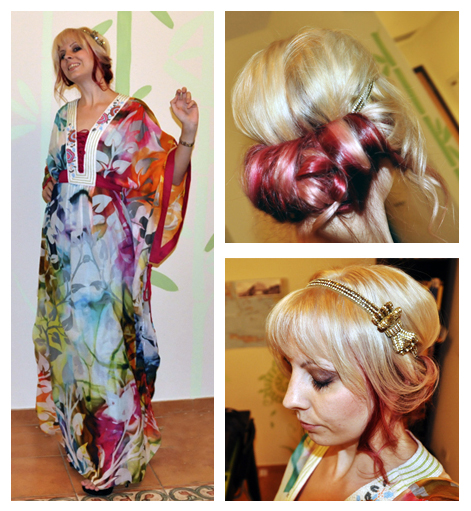 The henna night, or Laylat al Henna, (and definitely not to be confused with a hen night) is a traditional ladies-only celebration a few days before the wedding. Normally henna decoration would be applied to the bride-to-be and the females in attendance, but things in Dubai are not quite so traditional any more, so there was no henna (which I was kind of bummed about). In this case, the celebration is sometimes called instead Laylat al Arabiya, the “Arabian night”. Lack o’ henna aside, it was a beautiful evening of Arabian decor and fashion, food, music and celebration. For this event I chose something a bit more casual and bohemian…