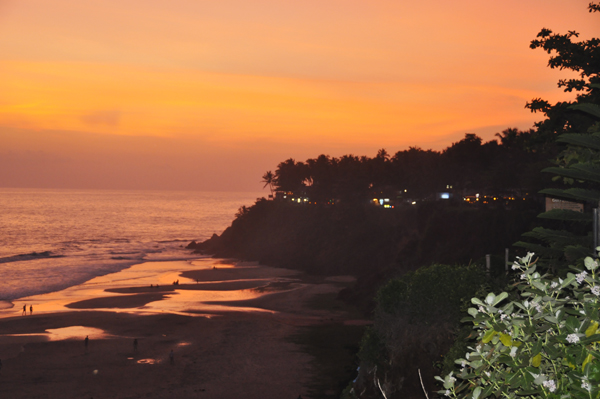 sunset in Varkala & the clifftop cafes begin to light upOn the downside, the Indian ocean at Varkala’s Papansam beach is noted for its strong currents and dangerously strong rip current. Immediately upon getting into the water, the current makes itself known and is possibly one of the strongest currents I’ve ever encountered. Thankfully I didn’t have any run-ins with the rip current, but this was usually marked on the beach with red flags so that you could steer clear of it. Sadly, on the morning of our final full day in Varkala and India, I noticed a great deal of people lining the clifftop and down at the beach (so many in fact, we decided against going to the beach that morning). I assumed it was maybe a holy day (one side of the beach was always full of people performing religious – Hindi – rites). Eventually I learnt that a boy had gone for a swim that morning but got pulled out to sea by the rip current. The search was on for his body all morning, hence all the morbid gawkers. The boy’s body was eventually found late morning, and it was all extraordinarily sad. That current is clearly no joke and something to be wary of when in Varkala.