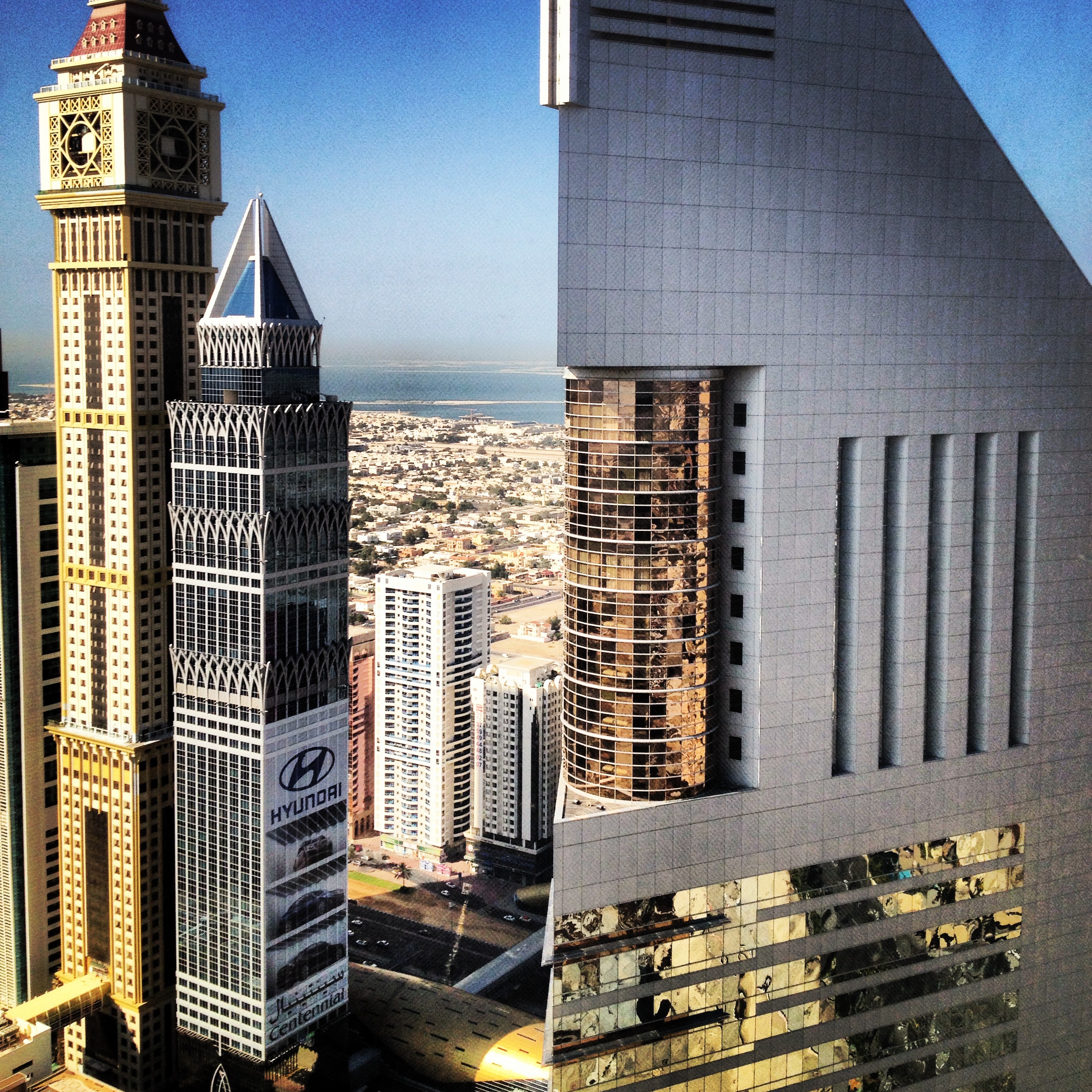 Looking towards Sheikh Zayed Road and the Gulf. Emirates Towers consists of two triangular buildings that mirror each other. That clock tower skyscraper has been at that level of completion for years. While I lived in Satwa, I had views of the Sheikh Zayed Road skyscrapers from my flat’s balcony and was forever wishing they’d install that damned clock already, for my own time-keeping benefit.