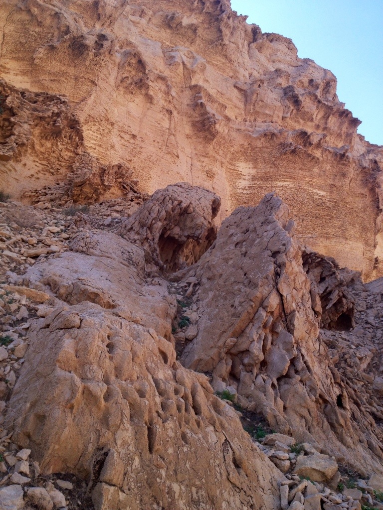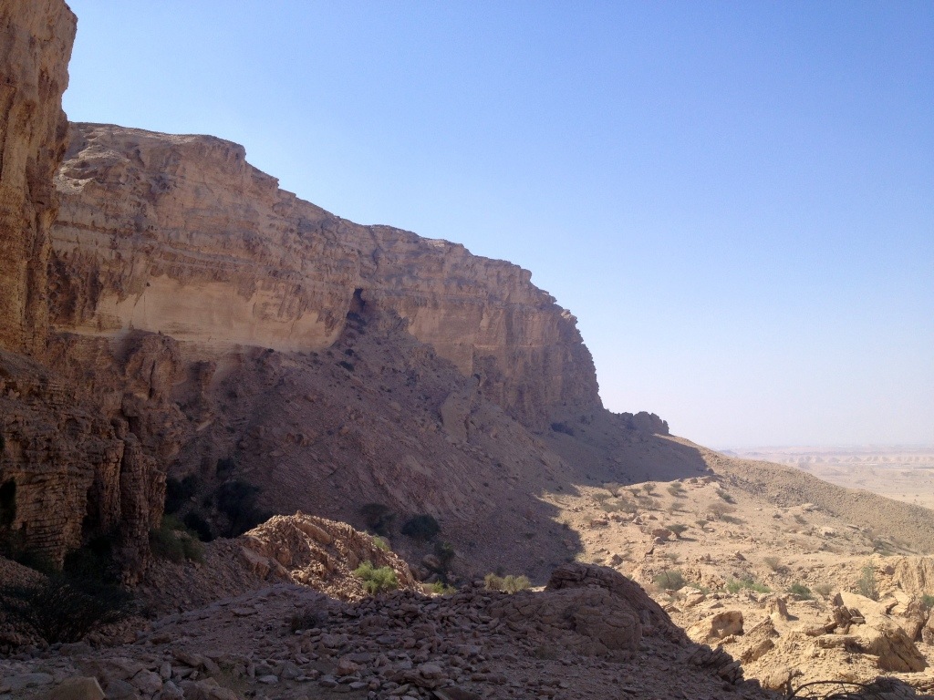 After driving down a dusty, rocky dirt track for a bit that is off of the main road, you’ll end up parking your car as close to the base of the ridges ahead of you as you can get. At this point, the location looks pretty much like every one in the region: craggedy-ass stark mountains, rocky hills, boulders hanging out with a few thorny bushes, and a moon-like gravel plain behind you (I want to start a photo game called ‘Moon or UAE?’ where you look at two photos and try to decide which is which, because I swear when you’re near the mountains or wadis, there is very little difference). Look up though, and you’ll see a cave high in the ridge (awesome, I love caves, even though common sense tells me I shouldn’t what with the horrifying centipedes, inbred freaks and who knows what else living in them) and some random plant life hanging off the cliff face.