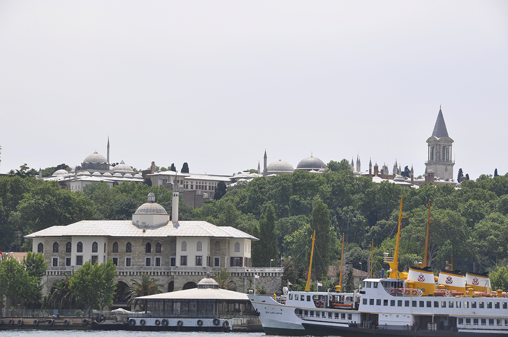 view of Topkapi Palace from the Bosphorus (buildings @ top)As if the palace itself weren’t enough, then you take a stroll through the Imperial Treasury, where there are literally, literally, chests full of emeralds. Oh and fabergé this and that and golden and gem-encrusted thrones. You know. Stuff. Oh and apparently some dagger (emerald-encrusted, natch) that was part of a movie called Topkapi that I never saw (or had even heard of) so I wasn’t hugely enthralled when I saw it, but a lot of other tourists clearly were.