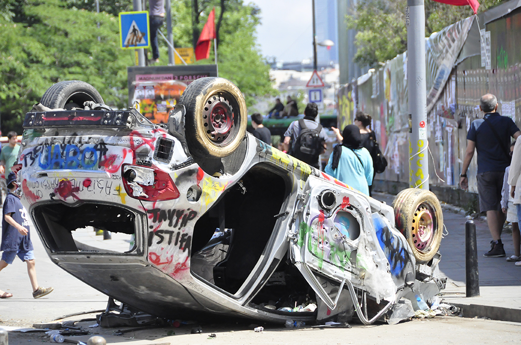 The place was trashed though. Stores must have been making a mint from selling spray paint because everything was covered in it (and in support of every cause, not only saving Gezi Park or anti-government: anarchist symbols, gay rights, pro-feminism, legalizing marijuana). The buildings in the square as well as down through Istiklal Cadessi, the overturned cars, the buses, the makeshift blockades, the streets and sidewalks – everything was graffiti’d.