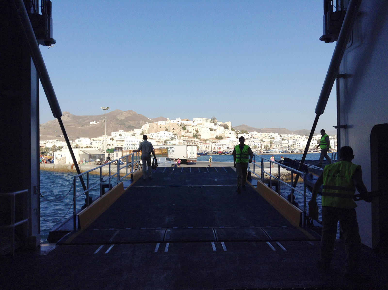 I don’t think I’ve ever felt like a caged beast more than I did while waiting in Santorini’s poorly-ventilated and overcrowded departures building in the ferry port. Hundreds (if not more) of people shoving themselves inside to escape the midday sun and wait for a ferry that would arrive to the port 15 minutes after we were scheduled to depart. It could be worse, I thought, as I figured we’d be hopping on to the ferry in a just a few minutes. Nope. We had to wait a further 45 minutes while the massive ferry heaved several hundred to a couple thousand people, and a long line of vehicles from its bowels. The ferry, the Blue Star Delos, was much larger than I was expecting (it fits 2,400 passengers and over 400 vehicles), but otherwise was more in line with what I was expecting from a ferry ride. Not a high speed catamaran as we’d previously taken, it would take about two hours to cover the less than 50 miles distance to Naxos. It was a much more enjoyable journey than the previous ferry however, as there was plenty of outdoor seating where you can relax and watch the neighboring islands pass by.
