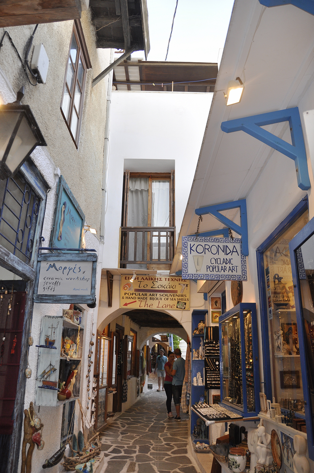 Temple of Apollo, with Chora in the background.Chrora, with both Cycladic and Venetian elements, was similar to the other towns we had visited, in that we were greeted by a mess of narrow (and sometimes very low-ceilinged!) pedestrianized lanes lined with restaurants, shops, and cats. At the center and top of the old town lays the Venetian castle, which is open to visitors as a small museum that can be toured (and free shots of ouzo are doled out at the end). The old town is a nice little spot, but hasn’t as much going on as the other towns we had visited to keep you entertained for an extended period of time.