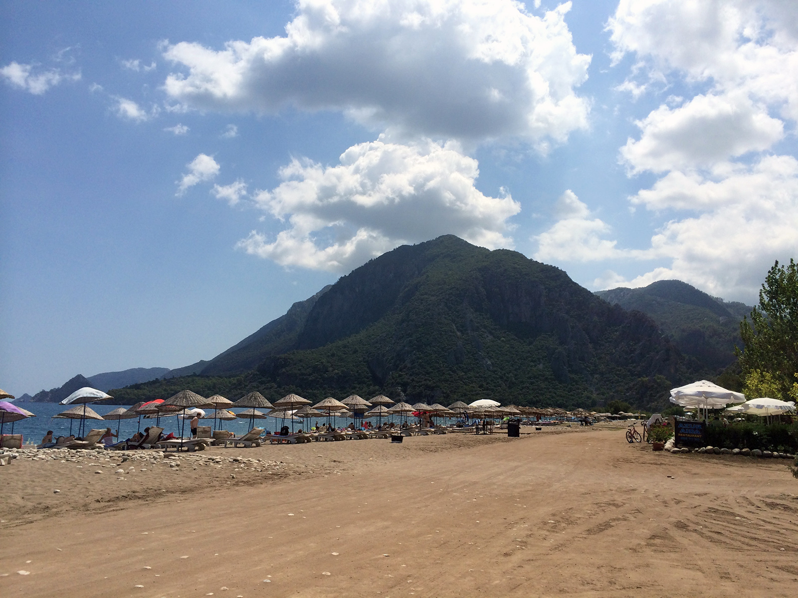 where we ended the trek, at some beach at the foot of some mountainIt didn’t last long. We left very early in the morning, but it wasn’t long before the sun reached the top of the dirt road we were walking up, blazing down on us is all its intensity directly in front of our faces. Knowing this would likely be the easiest part of the day’s walk (midday heat was still long off, we were on a dirt road instead of a boulder- and thorn-strewn path) I sort of lost it briefly. Pulling myself together, we continued on, shortly making it to the proper path, which was, as predicted, covered in boulders in and thorny bushes. And no shade. After struggling for a bit we decided we just couldn’t go on, and a couple hours later made it to a very relaxing beach – near the base of the mountain we had hoped to make it up the day before – where we had the chance to cool down before having a taxi collect us and bring us back to Kas (the beach had a surprise and very welcome new dirt road that we weren’t expecting but quickly made use of). We briefly considered relaxing there for the rest of the day and camping overnight on the beach, but after the previous night’s rather unpleasant tent experience, it was probably best to not.