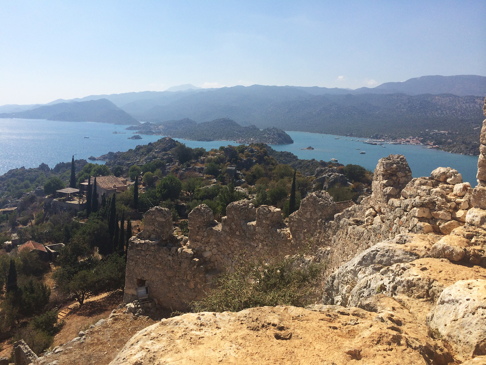 view from Kalekoy’s castle, with little Ucagiz in the backgroundOn the first day, a boat was arranged to take us a short way away to the neighboring town of Simena/Kalekoy, where we could grab some lunch, explore some castle ruins (“Kalekoy” means “castle’s village” in Turkish) and then stroll back onto the Lycian Way for a short walk back to Ucagiz. Simena was very picturesque with its pansiyons and restaurants clinging to the hillside, which was topped by a fantastic little castle, and some sunken tombs just offshore which you could swim around (and I did). I didn’t think people were as friendly there as Ucagiz and it attracts a lot of tour boats dropping visitors off for lunch during their Kekova day trips, but it’s definitely worth checking out, if even briefly. The walk back to Ucagiz was only a few kilometers, but without our full rucksacks, we made it in just about an hour – much better than the kilometer-per-hour time we were making the previous two days.