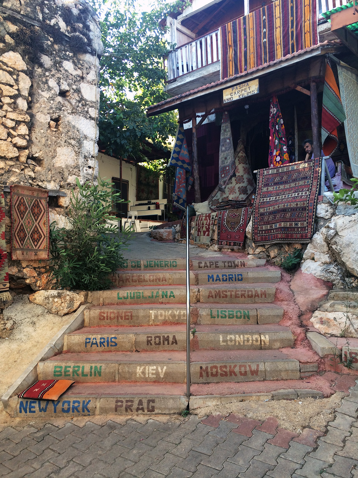 steps to a carpet shop in UcagizAfter spending an air conditioned night in Kas, we decided to change the format of the trek and base ourselves out of various towns along the route, taking on day treks along the Lycian Way where we could leave our heavy bags behind in pansiyons. Hopping into a taxi, we made our way to the much smaller seaside village of Ucagiz, where we should have arrived at the end of our second day of walking. But clearly didn’t. This ended up being one of our favorite stops of the trip thanks to its tranquillity, friendly residents and the plethora of activities which were available from the town. There are also some great shops filled with beautiful Turkish carpets (both modern and antique), where we picked up a great woven and embroidered kilim rug in warm tones for the living room.