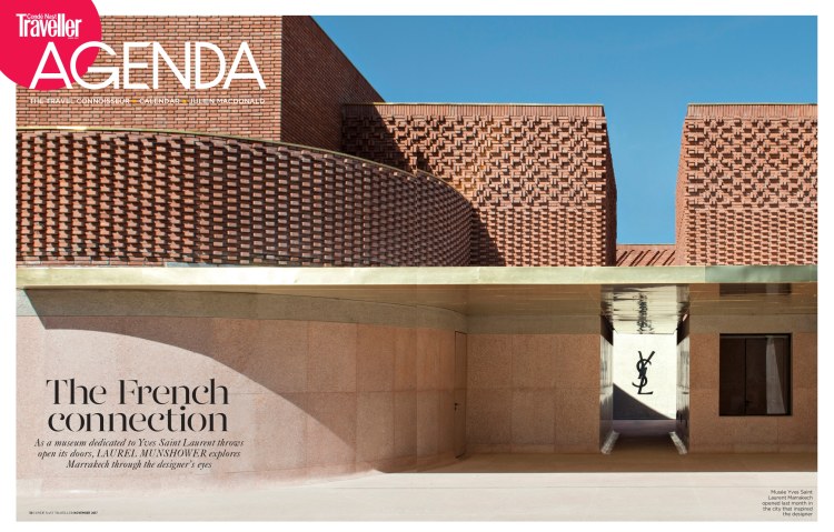the adjacent garden serves as a reminder that you’re on the street named for one of fashion’s most famed designers, and this, the Musée Yves Saint Laurent Marrakech (tickets AED 39; 00212- 52-429 1515, museeyslmarrakech.com), is the city’s latest attention- grabber. The museum’s harmonious design is no coincidence. Conceived, at the request of the late Pierre Bergé – Saint Laurent’s partner – to be simultaneously Moroccan and contemporary, the Studio KO-designed building evokes “the warp and weft of a fabric” through a pattern of bricks made from Moroccan earth. Though Bergé passed away mere weeks ahead of the museum’s October 19 opening (but not before he saw it completed), I can’t help but think he would be pleased with the scene before me: well-heeled visitors photograph themselves against the brand’s oversized logo in the sun-lit, circular entry; model and actress Marisa Berenson saunters past in vintage YSL and chunky Berber- style jewellery; hushed discussions take place alongside mannequins in striking looks.