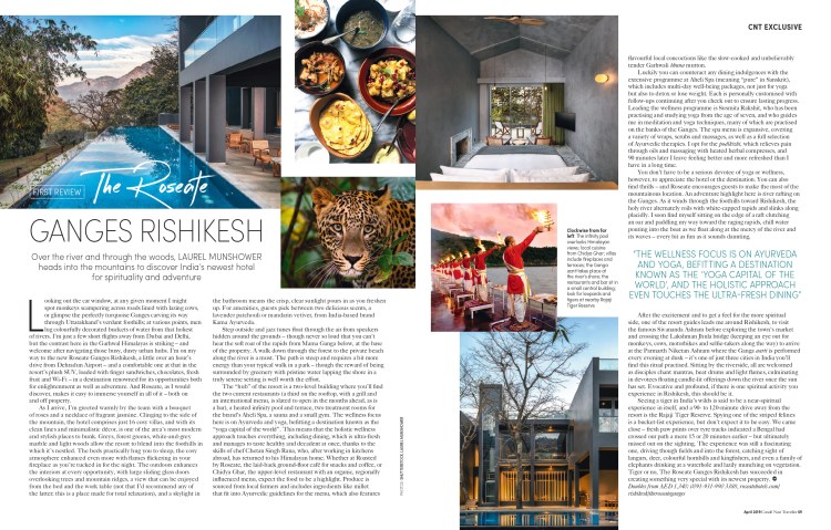 Looking out the car window, at any given moment I might spot monkeys scampering across roads lined with lazing cows, or glimpse the perfectly turquoise Ganges carving its way through Uttarakhand’s verdant foothills; at various points, men lug colourfully decorated buckets of water from that holiest of rivers. I’m just a few short flights away from Dubai and Delhi, but the contrast here in the Garhwal Himalayas is striking – and welcome after navigating those busy, dusty urban hubs. I’m on my way to the new Roseate Ganges Rishikesh, a little over an hour’s drive from Dehradun Airport – and a comfortable one at that in the resort’s plush SUV, loaded with finger sandwiches, chocolates, fresh fruit and Wi-Fi – in a destination renowned for its opportunities both for enlightenment as well as adventure. And Roseate, as I would discover, makes it easy to immerse yourself in all of it – both on and off property.